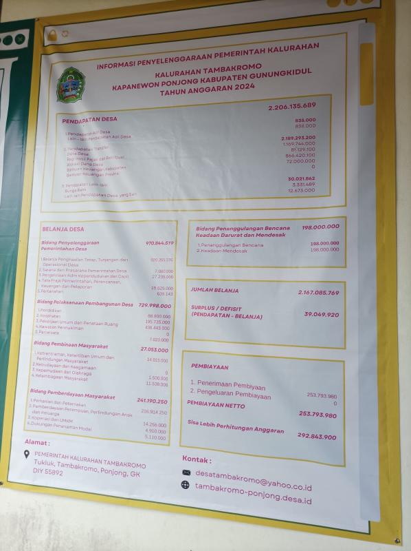 ambakromo SID; Pelaporan pelaksanaan kegiatan anggaran adalah kewajiban bagi penyelenggara negara yang mendapat alokasi dana dari anggaran daerah maupun pusat. Demikian halnya dengan Pemerintah Kalurahan Tambakromo sebagai instansi resmi yang melaksanakan anggaran yang bersumber dari alokasi anggaran negara wajib menyampaikan laporan realisasi pelaksanaan anggarannya kepada public. Untuk itu sebagai wujud tanggungjawab tersebut maka, berikut realisasi anggaran pendapatan dan belanja kalurahan Tambakromo tahun Anggaran 2024